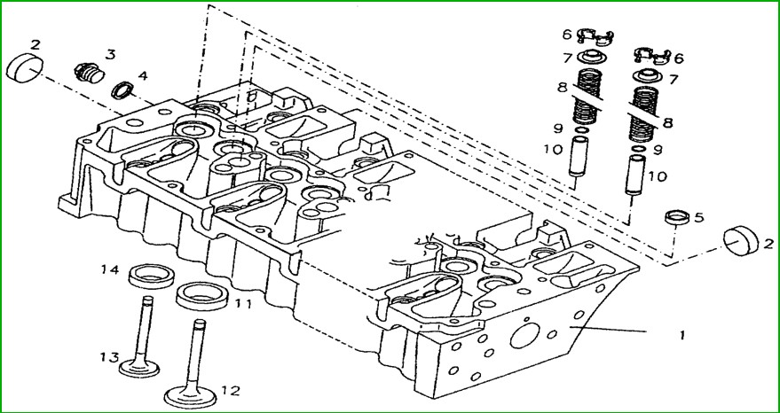 1.缸蓋 2.水套堵 3.螺塞 4.密封墊 5搖臂堵頭 6.氣門彈簧鎖片 7.彈簧座 8.氣門彈簧 9.o型圈 10.氣門導(dǎo)管 11.進(jìn)氣門座 12.進(jìn)氣門 13.排氣門 14.排氣門座