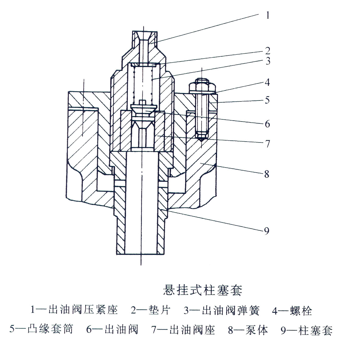 柱塞套9和出油閥6、出油閥座7都在凸緣套筒5內(nèi),并利用出油閥壓緊座1擰緊,使它成為一個獨立的組件。然后用兩個螺栓將凸緣套筒固定在泵體頂端面上,形成一種懸掛式結(jié)構(gòu)。在出油閥壓緊座擰緊后,柱塞套僅僅是上部臺肩承受壓力,而進、回油孔部位都不受力,從而避免了柱塞套在進、回油處受壓變形。