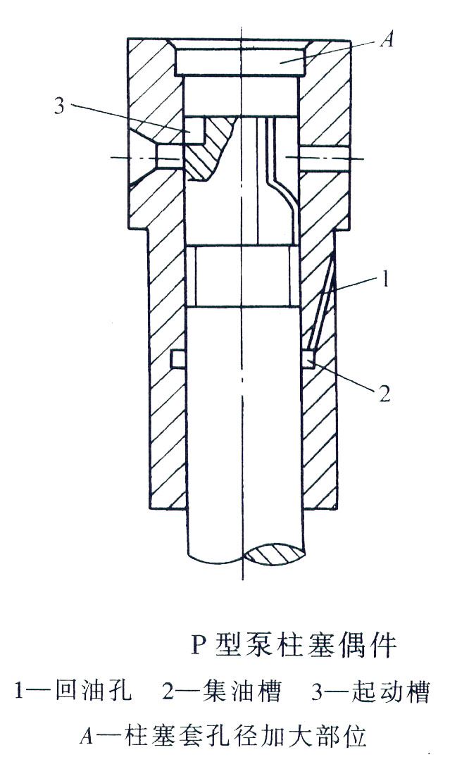 柱塞套A處孔徑略有加大,這樣可防止柱塞在上部位置卡死;孔的下部開一道環(huán)形集油槽2,從柱塞偶件間隙泄漏的燃油可集于槽內(nèi),經(jīng)回油孔1流回油泵的低于油腔,這樣便可防止燃油漏到泵底殼稀釋潤滑油。為了使發(fā)動機易于起動,在柱塞頂端開有起動槽3,當柱塞處于起動位置時,該槽與柱塞套進油孔處于相對的位置,這樣,只有柱塞上行到起動槽的下邊緣封閉進油孔時才能開始供油,因此可將供油始點延遲。這樣,可在氣缸內(nèi)有較高的壓縮溫度噴入燃油,有利于發(fā)動機起動。