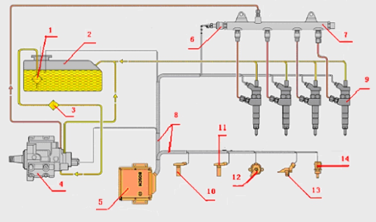 高壓共軌電控柴油機(jī)的基本結(jié)構(gòu)與機(jī)械CA4D32柴油機(jī)相似,所不同的是他的燃油系統(tǒng)采用全套BOSCH電控共軌燃油系統(tǒng),BOSCH電控共軌燃油系統(tǒng)組成由下圖所示: