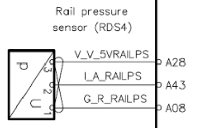 共軌壓力傳感器向ECU提供共軌中燃油壓力信息。通過(guò)線(xiàn)束與ECU發(fā)動(dòng)機(jī)端A28(5V+),A43(singnal),A08(-);測(cè)量范圍:0~180Mpa;供電電壓:5V;輸出電壓:0.5~4.6V