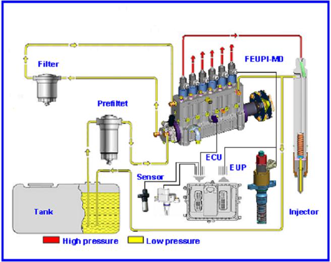 電控發(fā)動(dòng)機(jī)是由一汽技術(shù)中心開發(fā),并具有完全知識產(chǎn)權(quán)的電控系統(tǒng)。德爾福成熟的電控單體泵(EUP)集成(Integration)為FEUPI電控直列泵噴油系統(tǒng),ECU采用MOTOROLA,傳感器采用西門子。