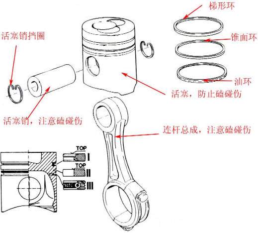 活塞裝連桿,安裝活塞環(huán)。注意不能裝反。連桿的字頭朝向必須和燃燒室凹坑(中心線分開(kāi)的大小面)小面一個(gè)方向?;钊^朝向飛輪,連桿字頭凸輪軸面。連桿小頭襯套與活塞銷0.03-0.08 。