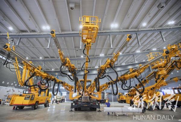 (鐵建重工展位的全智能三臂鑿巖石車。湖南日報·華聲在線記者 辜鵬博 攝)