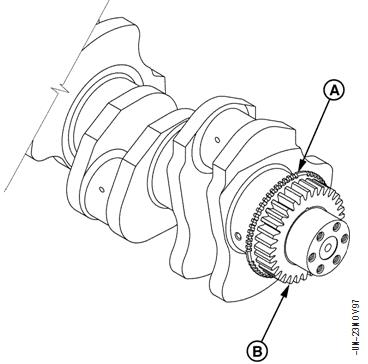 The crank timing wheel (A) is located on the front of the crankshaft, behind the pressed-on crank gear (B). The timing wheel is composed of 54 notches, divided into 3 groups of 18 notches. Before the first notch in each group is a flat area equal to 18 of crankshaft rotation, the following 17 notches are separated by 6 of crankshaft rotation. Each group of 18 notches and a flat area is equal to 120, or a third of a full turn.