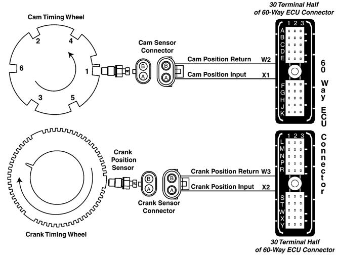 NOTE: For wiring and theory of operation information, see DTC SPN 637 FMI 7 CRANK POSITION/CAM POSITION OUT OF SYNC supporting information. 1. Ignition OFF 2. Cam position sensor connector and 60-way ECU connector still disconnected 3. Using a multimeter measure resistance between terminal W2 in the harness end of the 60-way ECU connector and: · A good ground · All other terminals in both ECU connectors |