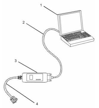 3. 將電纜(4)連接到通信適配器(3)的“數據鏈路”端和維修工具接頭之間。