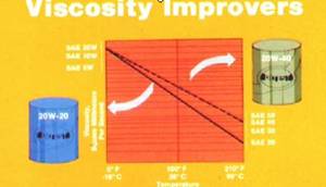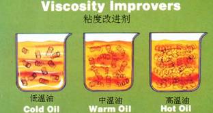 粘度改進(jìn)物質(zhì)通常是對(duì)溫度敏感的聚合物,在冷油中它們牢固地圈成螺旋狀對(duì)粘度只有一點(diǎn)影響,在熱的油中它們漸漸互相作用導(dǎo)致機(jī)油稠化。