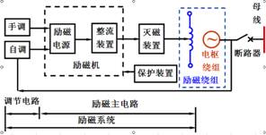 勵(lì)磁系統(tǒng):與發(fā)電機(jī)轉(zhuǎn)子回路電壓的建立、調(diào)整及其控制的有關(guān)元件和設(shè)備。包括發(fā)電機(jī)勵(lì)磁繞組、勵(lì)磁電源、自動(dòng)調(diào)壓器和手動(dòng)控制等部分,此外,還有強(qiáng)行勵(lì)磁、強(qiáng)行減磁、勵(lì)磁保護(hù)、滅磁等部件。