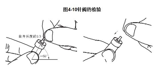 ③針閥偶件的配合間隙檢驗(yàn),可按圖4-10所示,將針閥體傾斜60°左右,針閥拉出1/3行程,放開后針閥應(yīng)能平穩(wěn)地滑入針閥座之中;重復(fù)上述動(dòng)作,每次轉(zhuǎn)動(dòng)針閥到不同位置,如針閥在某位置不能平穩(wěn)地下滑,說明針閥變形或表面損傷;若下滑速度過快,說明間隙因磨損而過大,出現(xiàn)以上兩種情況都應(yīng)更換針閥偶件。