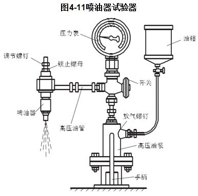 在洗凈噴油器后,將其裝在噴油器試驗(yàn)器上測試其開始噴油壓力和噴射霧化質(zhì)量,如圖4-11所示。測試前,應(yīng)操縱噴油器試驗(yàn)手柄反復(fù)做多次壓油動(dòng)作,使噴油器和高壓油管內(nèi)完全充滿柴油,然后再緩慢壓油(以60次/min為宜),同時(shí)觀察壓力表,當(dāng)讀數(shù)開始下降時(shí),即為噴油器開啟壓力。噴油器的開啟壓力應(yīng)符合標(biāo)準(zhǔn);若不符,應(yīng)視結(jié)構(gòu)擰動(dòng)調(diào)壓螺釘或更換調(diào)整墊片加以調(diào)整,調(diào)定后將鎖緊螺母擰緊并再次測試開始噴油壓力,直到符合要求為止。