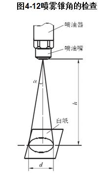 噴霧錐角的檢查可在距噴油器噴油孔100 -200mm處放一張白紙,紙面應(yīng)與噴油器軸線垂直,然后快速壓動(dòng)油泵手柄,做一次噴射,使油霧噴射在紙上,量出紙面到噴油器針閥端面的距離h和紙上的油跡直徑d就可計(jì)算得到霧錐角α ,如圖4-12所示。