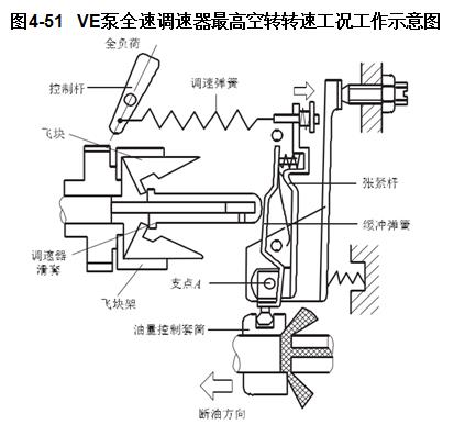 ④最高轉(zhuǎn)速工況。如圖4-51所示,當(dāng)控制桿在全負(fù)荷位置時(shí),隨著負(fù)荷的減小,柴油機(jī)轉(zhuǎn)速上升,使飛塊的離心力作用于調(diào)速器滑套上的力大于調(diào)速?gòu)椈傻膹椓?,則張緊桿與支承桿繞A點(diǎn)順時(shí)針轉(zhuǎn)動(dòng),使循環(huán)供油量減小,柴油機(jī)轉(zhuǎn)速便穩(wěn)定在相應(yīng)的工況下,直到外界負(fù)荷為零,通過(guò)調(diào)節(jié)循環(huán)供油量,使之保持最高穩(wěn)定轉(zhuǎn)速。