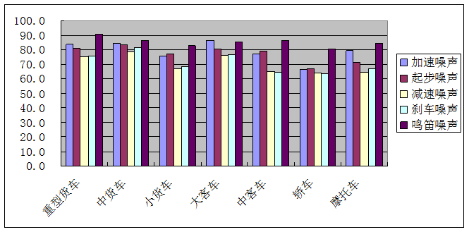 車輛的啟動噪聲和加速噪聲大于減速噪聲和剎車噪聲,除摩托車以外車輛的各種噪聲與發(fā)動機功率有一定正比關(guān)系。鳴笛噪聲聲級非常高,噪聲聲級明顯高于其他城市交通噪聲源。