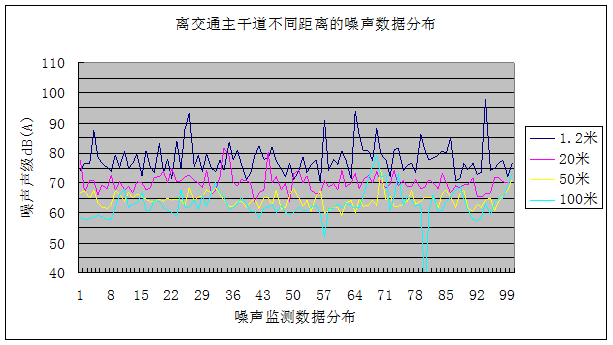 交通噪聲晝間。夜間和晝夜等效聲級高速公路最高,主干道此次,次干道更小。高所公路的晝間等效聲級為77.5dB(A)~78.1dB(A),夜間等效聲級為73.7 dB(A)~74.5 dB(A),晝夜等效聲級為80.6 dB(A)~81.4 dB(A);主干道的晝間等效聲級為75.9 dB(A)~77.1 dB(A),夜間等效聲級為71.5 dB(A)~73.7 dB(A),晝夜等效聲級為78.7 dB(A)~80.6 dB(A);次干道的晝間等效聲級為70.2 dB(A)~71.3 dB(A),夜間等效聲級為64.6 dB(A)~67.2 dB(A),晝夜等效聲級為72.2 dB(A)~74.2 dB(A);監(jiān)測結(jié)果晝夜等效聲級比晝間和夜間等效聲級都大,這是因為計晝夜等效聲級時,夜間要加10 dB(A),這只要是考慮到夜間噪聲干擾程度較大。