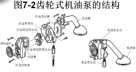 進油管安裝于泵體一側,與機油泵的進油腔連通。集濾器固定在進油管的端口,對進入機油泵的機油進行過濾。機油泵出油腔與前端蓋的出油管連通,出油管直接與缸體主油道連通。限壓閥安裝于出油管一側。