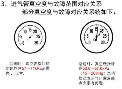 對于非增壓發(fā)動機(jī)可以通過真空表對進(jìn)氣管的真空度進(jìn)行檢測。當(dāng)發(fā)動機(jī)汽缸與活塞磨損、配氣機(jī)構(gòu)技術(shù)狀況不良時,會對進(jìn)氣管真空度產(chǎn)生影響。