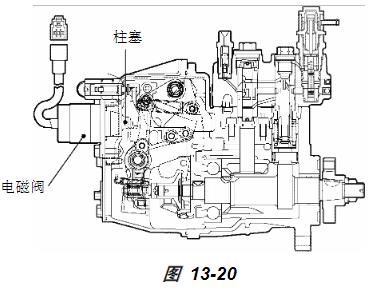 吸引柱塞需要在吸引線圈上施加大電流。這是對所有類型電磁閥的共同要求。產(chǎn)生的磁力稱為吸引力,導(dǎo)致產(chǎn)生吸引力的電流稱為吸引電流。具有本功能的部件稱為吸引線圈。柱塞被吸引后保持柱塞的磁力就小一些了。本過程中需要的磁力稱為保持力,而用于產(chǎn)生保持力度電流稱為保持電流。具有此功能的部件稱為保持線圈。TNV 停機(jī)電磁閥的工作(圖 13-20)顯示的是帶有配備了停機(jī)電磁閥的調(diào)速器的 TNV 發(fā)動機(jī)。將鑰匙轉(zhuǎn)到 ON 位置給吸引線圈通電以吸引柱塞。柱塞與調(diào)速器部件沒有連接??刂迫加蛧娚涞凝X條處于自由狀態(tài),因此當(dāng)您拖動起動馬達(dá)時燃油噴射系統(tǒng)會立即參與發(fā)動機(jī)運行。將鑰匙轉(zhuǎn)到 OFF 位置,消除保持線圈內(nèi)的磁力,回位彈簧將柱塞推出。隨即,柱塞通過調(diào)速器將齒條送回燃油截止位置,發(fā)動機(jī)停機(jī)。