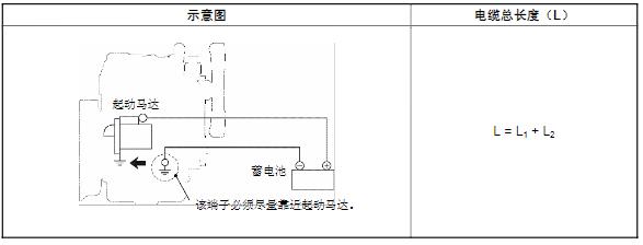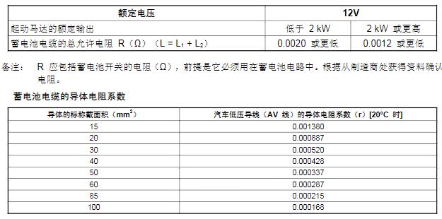 電纜規(guī)格和長(zhǎng)度的確定最適當(dāng)?shù)碾娎|規(guī)格和長(zhǎng)度可以通過(guò)確定蓄電池電纜的允許電阻(Ω)(取決于起動(dòng)馬達(dá)的額定輸出)以及每種規(guī)格的電纜的導(dǎo)體電阻系數(shù)(Ω/ m)求得。蓄電池電纜的允許電阻蓄電池電
