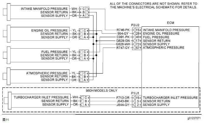 壓力傳感器接線圖測(cè)試步驟 1.檢查電氣接頭和電線g01237071A.斷開(kāi)發(fā)動(dòng)機(jī)ECM的電源