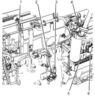 圖12901142382壓力傳感器位置(發(fā)動(dòng)機(jī)左側(cè)視圖)(1) 進(jìn)氣歧管壓力傳感器(2) 燃油壓力感應(yīng)塞(3) 大氣壓力感應(yīng)塞(4) 機(jī)油壓力感應(yīng)塞(5) J2/P2 ECM 接頭 (6) J1/P1 ECM 接頭