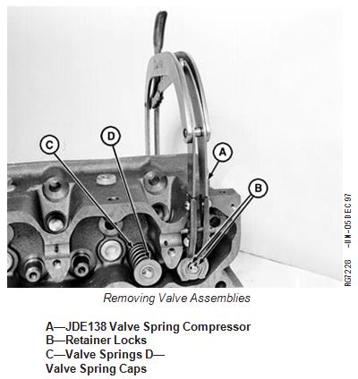 4.拆下約翰迪爾氣門彈簧蓋(D)和氣門彈簧(C)。