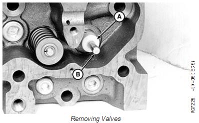 5.從排氣閥上拆下機油護罩(A)。從氣缸蓋上拆下閥(B)。如果閥門要重復使用,則確定重新組裝的閥門。
