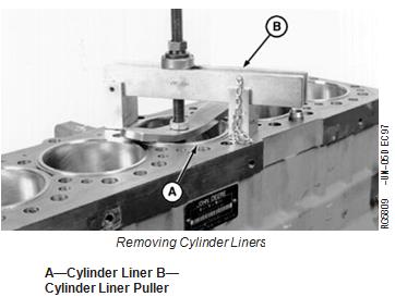 3. Use D1062AA or D01073AA Cylinder Liner Puller (B) to remove cylinder liner (A).