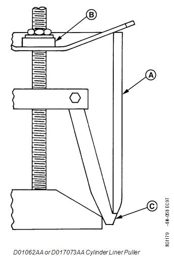Cylinder Liner Puller (B) to remove liners (A), be sure jaw (C) of puller is correctly positioned before attempting to remove liner.
