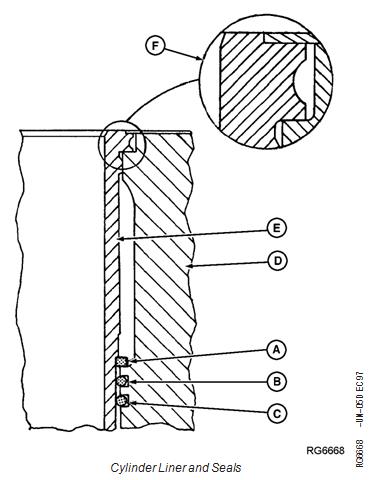 4. Remove the cylinder liner square packing (A) from liner, (E).