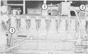 當卡特CAT發(fā)動機在低于運轉(zhuǎn)溫度情況下運行時,后冷卻機冷卻劑回路關閉。輔助水泵(3)通過水管以大約570升/分(150美制加侖/分)的速度向后冷卻機傳送冷卻劑。冷卻劑向上流經(jīng)后冷卻機的核心組件然后通過冷卻劑回流管(2)流出后冷卻機,經(jīng)過恒溫閥返回輔助水泵。當冷卻劑溫度升高時,恒溫閥打開,從后冷卻機核心組件流出的冷卻劑直接進入散熱器或熱轉(zhuǎn)換器降溫,然后返回輔助水泵。恒溫閥在冷卻劑溫度高于32攝氏度(90華氏度)或54攝氏度(130華氏度)時會全開,具體情況依安裝在閥套上的恒溫器而定。