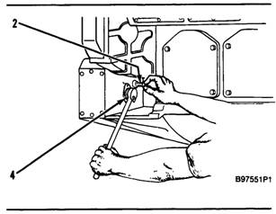 2. 將定時(shí)螺栓(2)[使外蓋(1)與飛輪罩固定的長(zhǎng)螺栓]放入飛輪罩的定時(shí)孔中。使用9S9082卡特CAT發(fā)動(dòng)機(jī)車刀(4)和一個(gè)1/2英寸傳動(dòng)棘輪扳手按照卡特CAT發(fā)動(dòng)機(jī)正常轉(zhuǎn)動(dòng)時(shí)轉(zhuǎn)動(dòng)方向來(lái)轉(zhuǎn)動(dòng)飛輪,直到定時(shí)螺栓與飛輪螺紋孔嚙合。