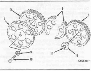 c. 在凸輪軸左側(cè)安裝速度/定時(shí)圓環(huán)(7)、螺栓(10)和墊圈(9),并/或在凸輪軸右側(cè)安裝螺栓(11)和墊板(12)以保持凸輪軸傳動(dòng)齒輪與凸輪軸接合。