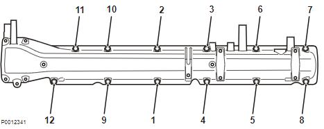 帶有渦輪閥殼體的排氣歧管(僅適用于 D13B-A/H 和舷內(nèi)發(fā)動(dòng)機(jī) D13B-C/L, D13C4-A)步驟 1:緊固所有螺栓直至它們接觸(5 ± 1.5 Nm) [3.69 ± 1.11 lbf ft]步驟 2:扭矩緊固螺栓5、8 和 6、 750 ± 4 Nm (36.9 ± 2.95 lbf ft)扭矩緊固螺栓1、4 和 9、1210 ± 1.5 Nm (7.38 ± 1.11 lbf ft)步驟 3:扭矩緊固螺栓10 和 1148 ± 4 Nm (35.4 ± 2.95 lbf ft)扭矩緊固螺栓9 和 1248 ± 4 Nm (35.4 ± 2.95 lbf ft)扭矩緊固螺栓2 和 348 ± 4 Nm (35.4 ± 2.95 lbf ft)扭矩緊固螺栓1 和 448 ± 4 Nm (35.4 ± 2.95 lbf ft)扭矩緊固螺栓5 和 850 ± 4 Nm (36.9 ± 2.95 lbf ft)扭矩緊固螺栓6 和 750 ± 4 Nm (36.9 ± 2.95 lbf ft)排氣歧管(僅適用于D13B-B/D/E/F/G/J/K/M/N, D13C1-A, D13C2-A, D13C3-A和 IPS發(fā)動(dòng)機(jī)D13B-C/L, D13C4-A)步驟 1:緊固所有螺栓直至它們接觸(5 ± 1.5 Nm) [3.69 ± 1.11 lbf ft]步驟 2:扭矩緊固螺栓1、4 和 5、8 和 9、1210 ± 1.5 Nm (7.38 ± 1.11 lbf ft)步驟 3:扭矩緊固螺栓10 和 1148 ± 4 Nm (35.4 ± 2.95 lbf ft)扭矩緊固螺栓9 和 1248 ± 4 Nm (35.4 ± 2.95 lbf ft)扭矩緊固螺栓6 和 748 ± 4 Nm (35.4 ± 2.95 lbf ft)扭矩緊固螺栓5 和 848 ± 4 Nm (35.4 ± 2.95 lbf ft)扭矩緊固螺栓2 和 348 ± 4 Nm (35.4 ± 2.95 lbf ft)扭矩緊固螺栓1 和 448 ± 4 Nm (35.4 ± 2.95 lbf ft)03-2 技術(shù)參數(shù),發(fā)動(dòng)機(jī)47702575 01-2022 © AB VOLVO PENTA25