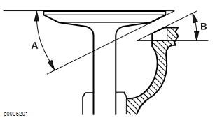 閥桿,直徑:進(jìn)氣門/排氣門8 mm(0.315 英寸)閥座角度(A):進(jìn)氣門24,5° ± 0,2°出口39,5°缸蓋上的閥座角度(B):進(jìn)氣門25°出口40°Ap0005203技術(shù)參數(shù)最小值(A)磨損值氣門頭和缸蓋平面之間的尺寸(A):進(jìn)氣門1.0 mm(0.0394 英寸)最大值 1.7 mm(0.0669 英寸)出口1.35 mm(0.0531 英寸)最大值 2.1 mm(0.0827 英寸)03-2 技術(shù)參數(shù),發(fā)動機(jī)47702575 01-2022 © AB VOLVO PENTA33