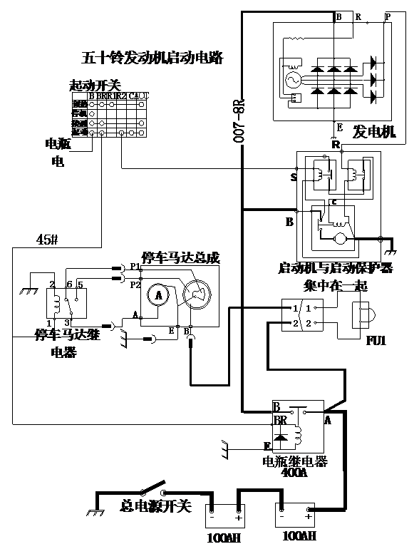 一般原因有點火開關、停車馬達繼電器、停車馬達及起動機不工作、電瓶繼電器不好、電池在起動瞬間壓降過大等。相關電氣原理如圖所示; (1)點火開關:當點火開關打到起動檔時,不能起動請檢查點火開關BR端是否有電,有電為正常,若無電可判斷點火開關壞(B端有電)。 (2)停車馬達繼電器:點火開關BR端輸出電給停車馬達繼電器若停車馬達繼電器觸點(3、5)不閉合,停車馬達總成拉線就不會拉合,不能把油路打開。經(jīng)檢查停車繼電器線圈(1、2)沒有24V電壓請檢查線路,若有24V電壓,請更換停車馬達繼電器。 (3)停車馬達總成:停車馬達繼電器(3、5)觸點閉合,若停車馬達總成拉線沒有拉合油路,請檢查線路是否接觸不好,線路正常請更換停車馬達總成。 (4)起動機不工作:上電正常后,鑰匙起動開關打到起動位置時,鑰匙開關的起動端R2端應有電源輸出。若無輸出,鑰匙開關損壞;鑰匙開關起動端有輸出到啟動繼電器后,測量啟動繼電器輸出端是否有輸出。若沒輸出兩種原因: a.啟動繼電器的發(fā)電信號端有電源電壓(檢查發(fā)電信號端信號的輸入是否與電源有短路現(xiàn)象或發(fā)電機中點輸出不正常)。 b.啟動繼電器損壞;若啟動繼電器輸出正常,則檢查啟動繼電器輸出端到起動機之間的線束連接是否完好(測量起動機端的起動線是否有電壓);若以上情況完全正常,可以判斷為起動機不能正常工作。檢查系統(tǒng)搭鐵線(電瓶負極線、發(fā)動機搭鐵線)及起動機電源線(從電瓶正極到起動機聯(lián)線)是否接觸良好。經(jīng)過以上檢查后不能解決問題請聯(lián)系發(fā)動機廠家。 (5)檢查電瓶繼電器,在上電后,用萬用表測量電瓶繼電器控制端是否有電壓,負極搭鐵是否良好,電瓶負極搭鐵是否良好,如正常進行下一步。 (6)在啟動瞬間,在儀表上觀察系統(tǒng)電壓是否壓降過大,如壓降過大現(xiàn)象,更換電瓶重新啟動。