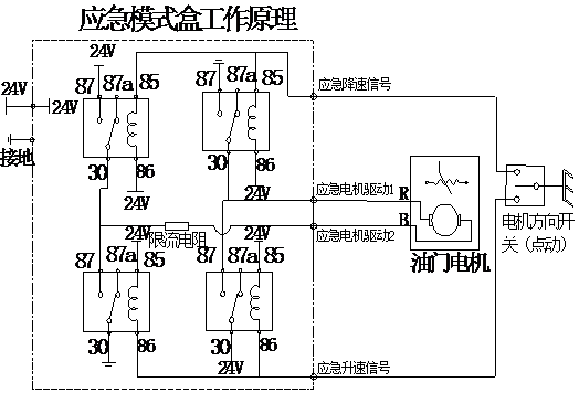 (1)上電時點動電機方向開關(guān),用萬用表檢測油門電機驅(qū)動線(38#、39#)是否有24V電壓輸出,如有電壓請檢查油門電機如油門電機壞請更換。如沒有電壓輸出請分段檢測線束及接插件,線束是否有破損短路現(xiàn)象,接插件是否有接觸不良的現(xiàn)象,如線束和接插件都完好,請進行下一步。 (2)在駕駛室座位底下打開電氣控制板,點動電機方向開關(guān)聽?wèi)?yīng)急模式盒內(nèi)是否有“滴答、滴答”繼電器吸合的聲音,若吸合但沒有24V輸出請更換應(yīng)急模式盒。 (3)若使用應(yīng)急模式時油門電機不能驅(qū)動到最大轉(zhuǎn)速,請檢查油門電機是否有卡死現(xiàn)象不能驅(qū)動到最高轉(zhuǎn)速,如電機完好請檢查應(yīng)急模式盒內(nèi)限流電阻(28歐姆)是否阻值過大不能驅(qū)動電機到最高轉(zhuǎn)速,如遇到該情況請聯(lián)系相關(guān)技術(shù)服務(wù)處。 相關(guān)應(yīng)急模式盒原理圖: