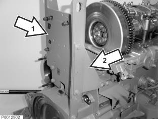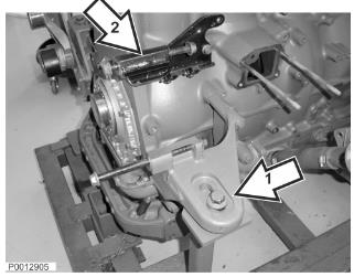 5 安裝前左發(fā)動(dòng)機(jī)機(jī)腳(1)。交流發(fā)電機(jī)連接件(2)。扭轉(zhuǎn)所有發(fā)動(dòng)機(jī)機(jī)腳螺栓;參見(jiàn)功能組 21 - 發(fā)動(dòng)機(jī) 8 頁(yè)。