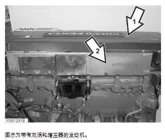 18 檢查閥蓋襯墊。安裝閥蓋(1)。僅適用于 D13B-A/C/G/H/K/L,D13C2-A,D13C4-A將隔熱罩(2)安裝到歧管上方。
