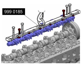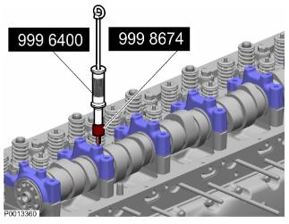 26 拆下凸輪軸蓋。使用 9996400 滑動錘和9998674 適配器。將軸承蓋放在一邊,使軸承上半部分處于正確順序。