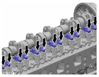 48 按照缸蓋上的標(biāo)記安裝凸輪軸軸承支架,確保它們與缸蓋鄰接。將軸承殼放在軸承支架中。