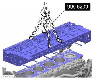 36 注意 在缸蓋和吊鏈之間放上墊圈以保護(hù)缸蓋密封表面。用兩個(gè)吊鏈、工具 9996239 提升工具提出缸蓋。拆下缸蓋襯墊。