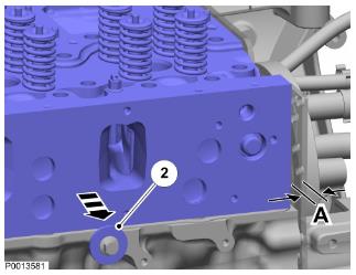 43 安裝螺栓和墊圈(1)。螺栓可以只旋轉(zhuǎn)幾圈。將缸蓋放下至合適的位置。確保墊圈(1)最終位于發(fā)動機(jī)機(jī)體邊緣外。然后擰緊螺栓,使墊圈向側(cè)面拉動缸蓋直到它接觸發(fā)動機(jī)機(jī)體側(cè)上的兩個(gè)墊圈(2)。