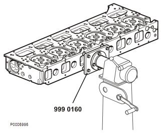 2 將工具9996159 適配器和工具9998246 沖頭(入口)或工具 9990174 沖頭(出口)安裝到液壓汽缸上。將工具放在缸蓋固定螺栓用孔中。擰緊工具螺母。