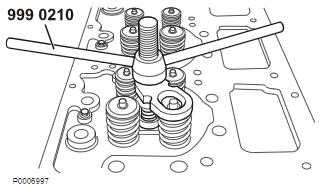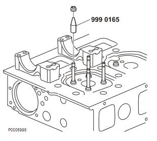 2 將工具 9990165 導(dǎo)軌套筒安裝在閥桿上并將新油封向下壓到閥導(dǎo)管上。注意 檢查并確保正確壓下了油封。如有必要,則使用 88800151 沖頭并用塑料錘小心敲擊。