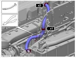 4 拆下沃爾沃volvo恒溫器和熱交換器之間的水管。注意 向前拉動管路以便于接近。