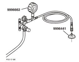 3 使用 9996441 罩,帶連接接頭更換加注口蓋。將9996662 壓力測試套件與蓋連接。將壓縮空氣連接至設(shè)備中并打開旋塞。使用調(diào)節(jié)旋鈕將壓力調(diào)節(jié)至 70 kPa (0.7 bar)。然后關(guān)閉旋塞。