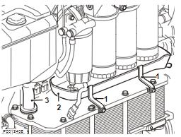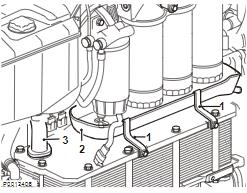 17 檢查并確保沃爾沃發(fā)動(dòng)機(jī)熱水管密封件(3)無(wú)故障并緊固管路。安裝過(guò)濾器油滴盤(2)和油滴盤連接接頭裝置(1)。