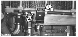 12 將熱交換器提升到前部連接接頭裝置上,同時(shí)將后部螺栓(2)放在后連接板的槽內(nèi)。將兩個(gè)底部螺栓(1)插入后部連接接頭裝置中。