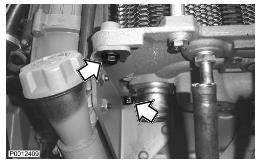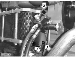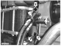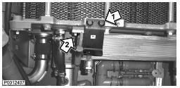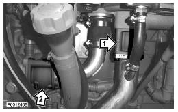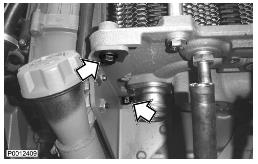 9 拆下燃油系統(tǒng)手泵下方的兩個(gè)熱交換器螺栓(1)。擰松手泵上方螺栓(2)幾圈。